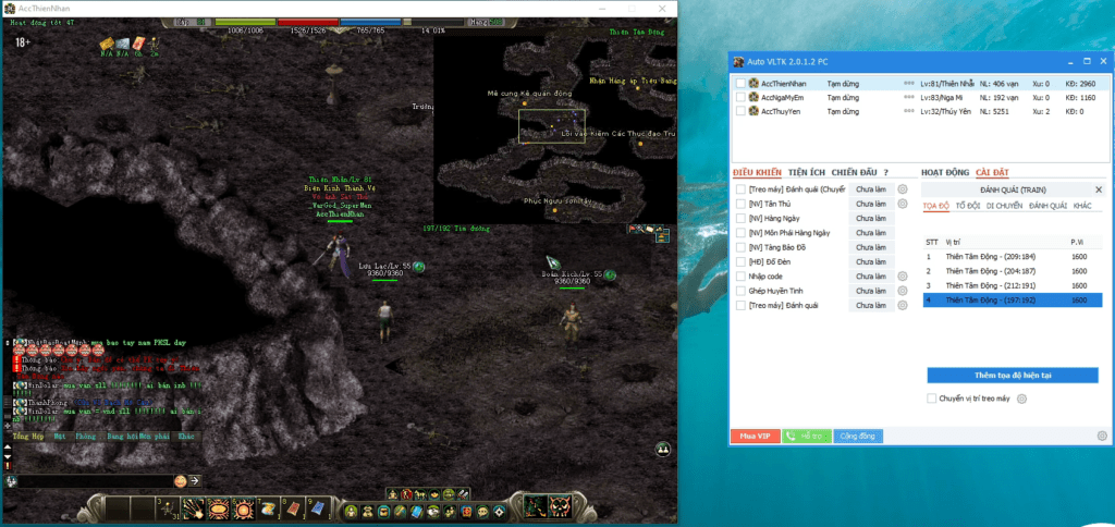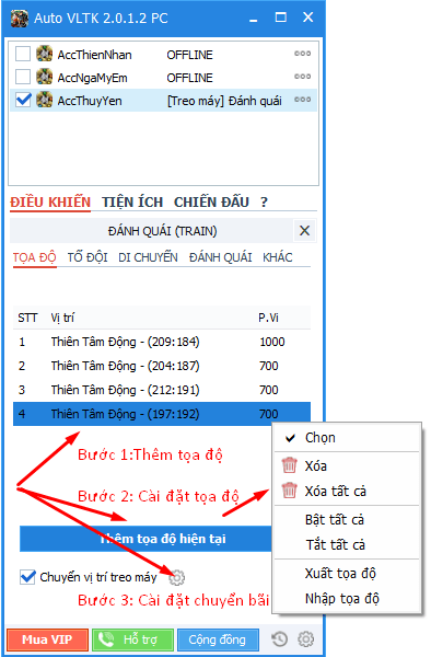 Sau khi đăng nhập game thành công -> Di chuyển nhân vật tới vị trí mong muốn train -> Chọn “Thêm tọa độ hiện tại” để lưu vào danh sách