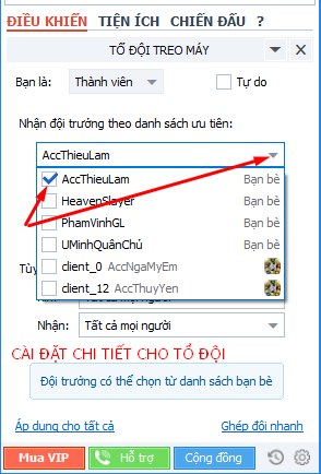Cách cài đặt tổ đội và theo sau cho thành viên: