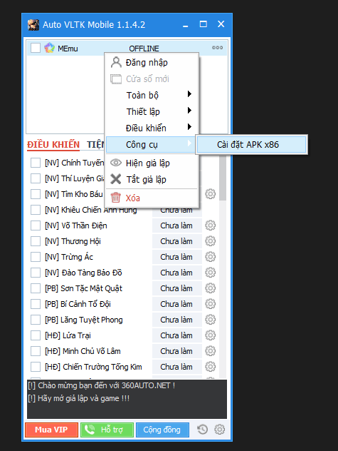Mở Auto Võ Lâm Truyền Kỳ Mobile -> Chọn danh sách giả lập -> Chọn giả lập cần cài game -> Nhấp phải chọn “Công cụ” -> Cài đặt APK x86 -> Chọn file APK vừa tải về